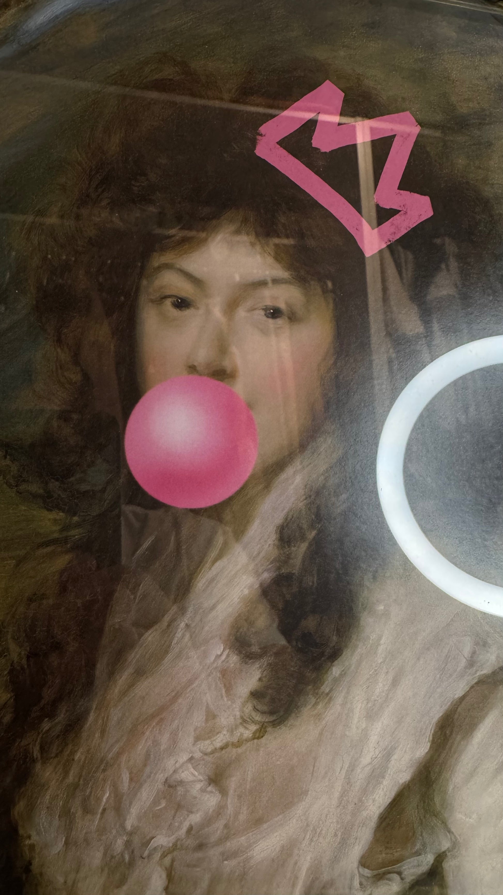 Inspired by 18th-century aristocratic portraiture, the artist overlays whimsical graffiti elements—a pink crown and a bubblegum pop—onto the image of a noblewoman.