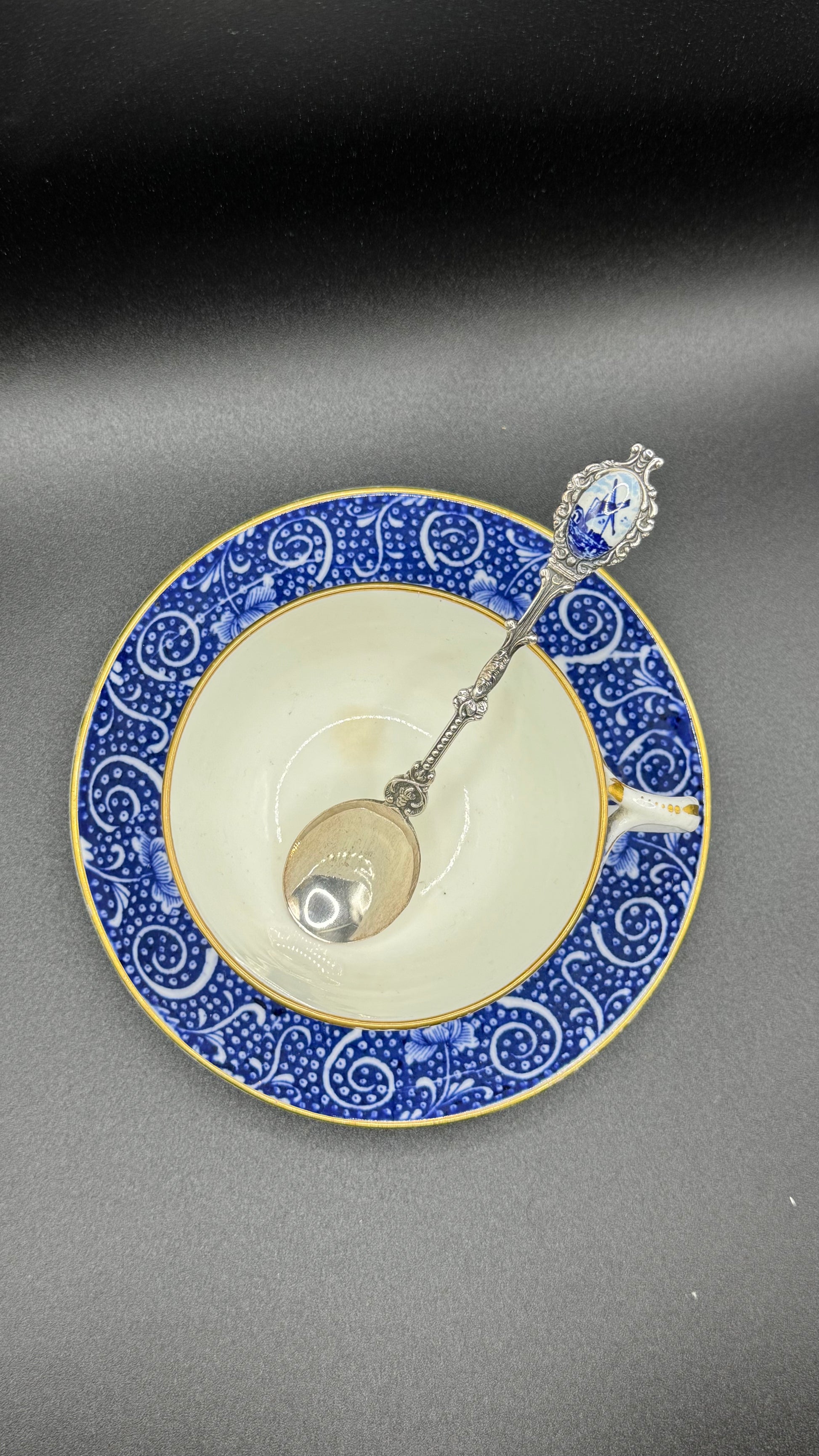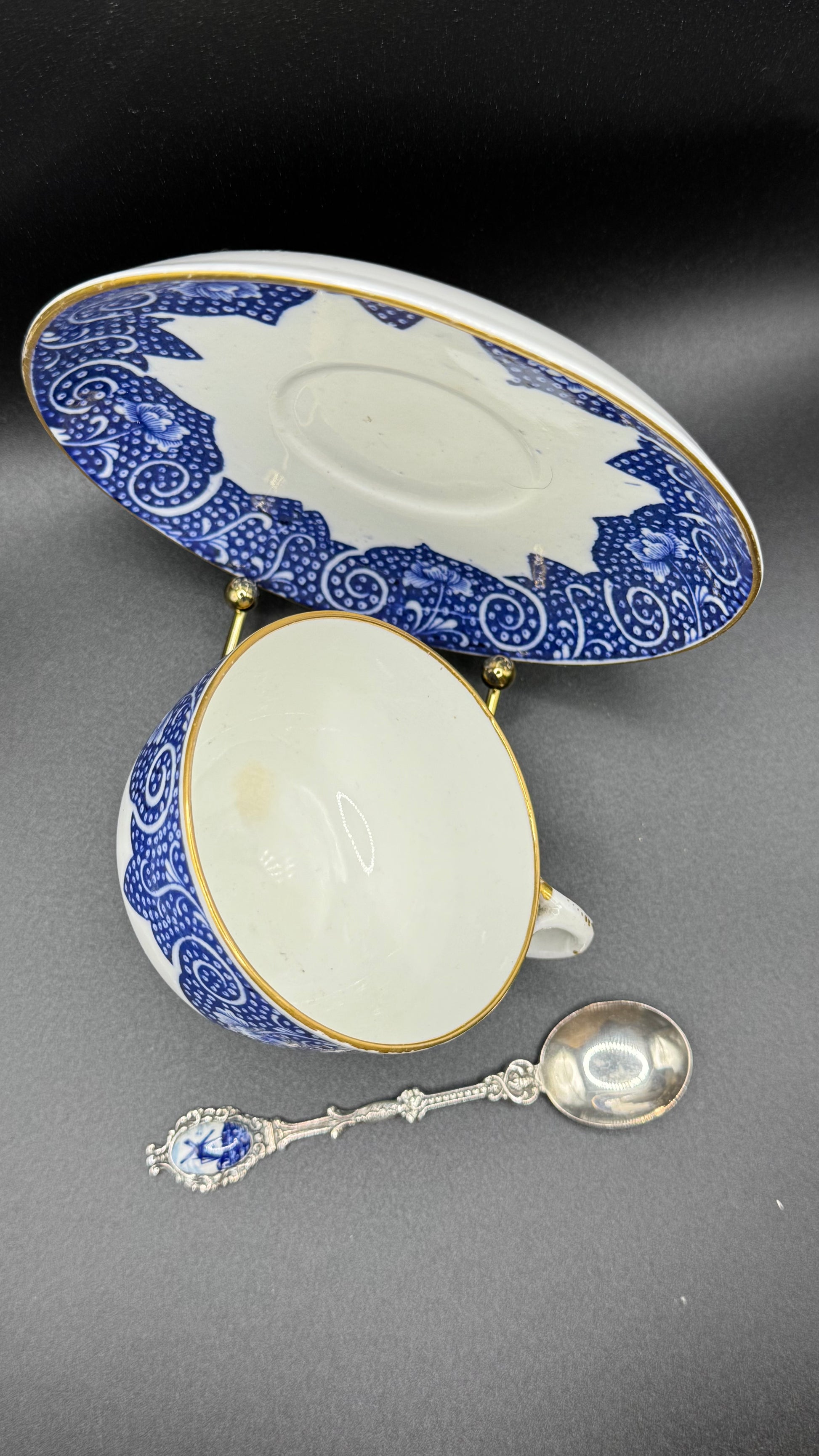 Antique Coalport Blue & White Cup and Saucer with Silver Spoon – 19th Century English Porcelain