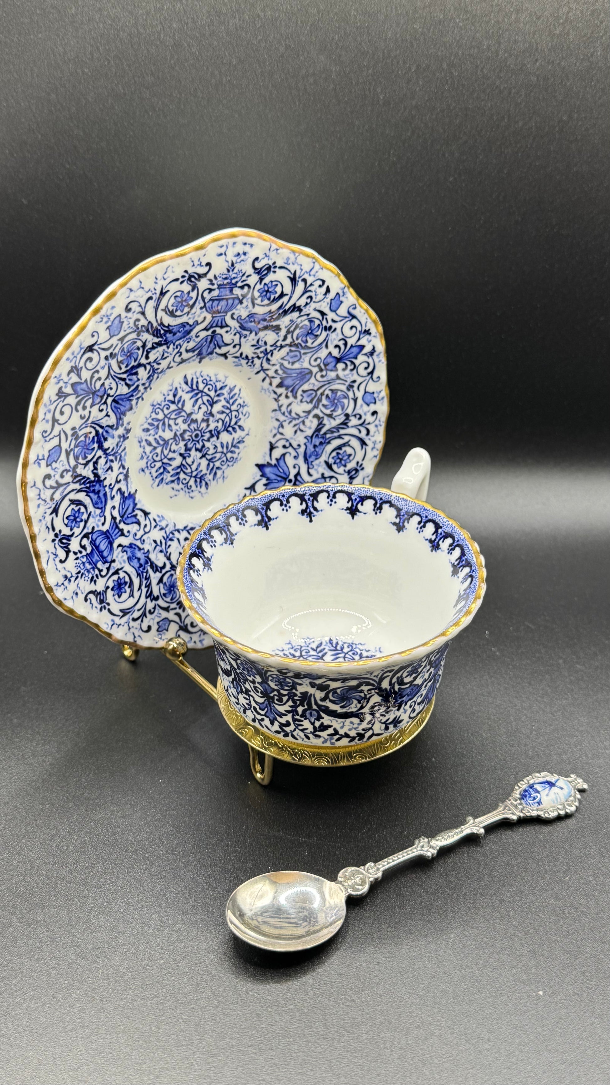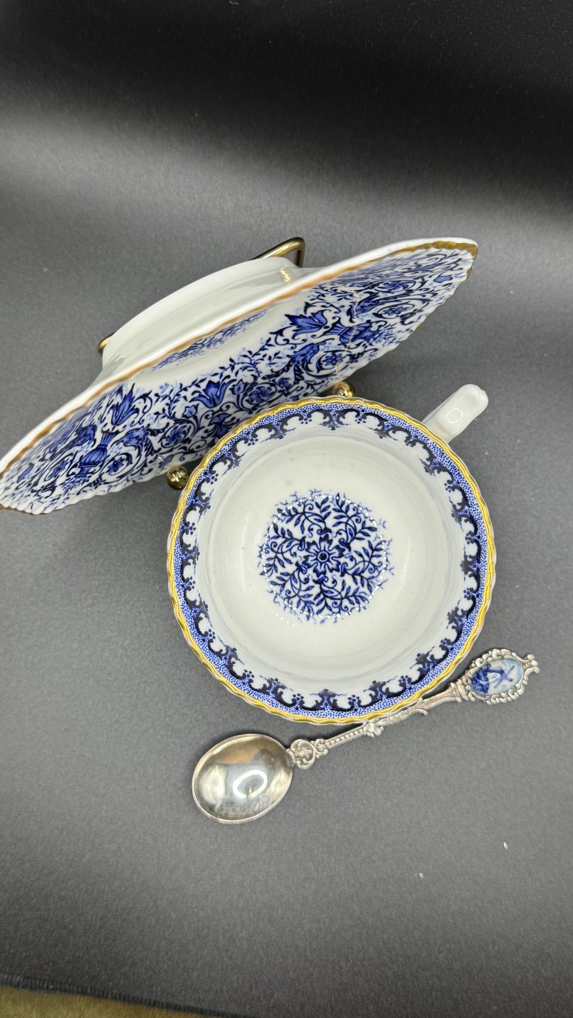 Antique Coalport Blue & White Cup and Saucer with Silver Spoon – 19th Century English Porcelain