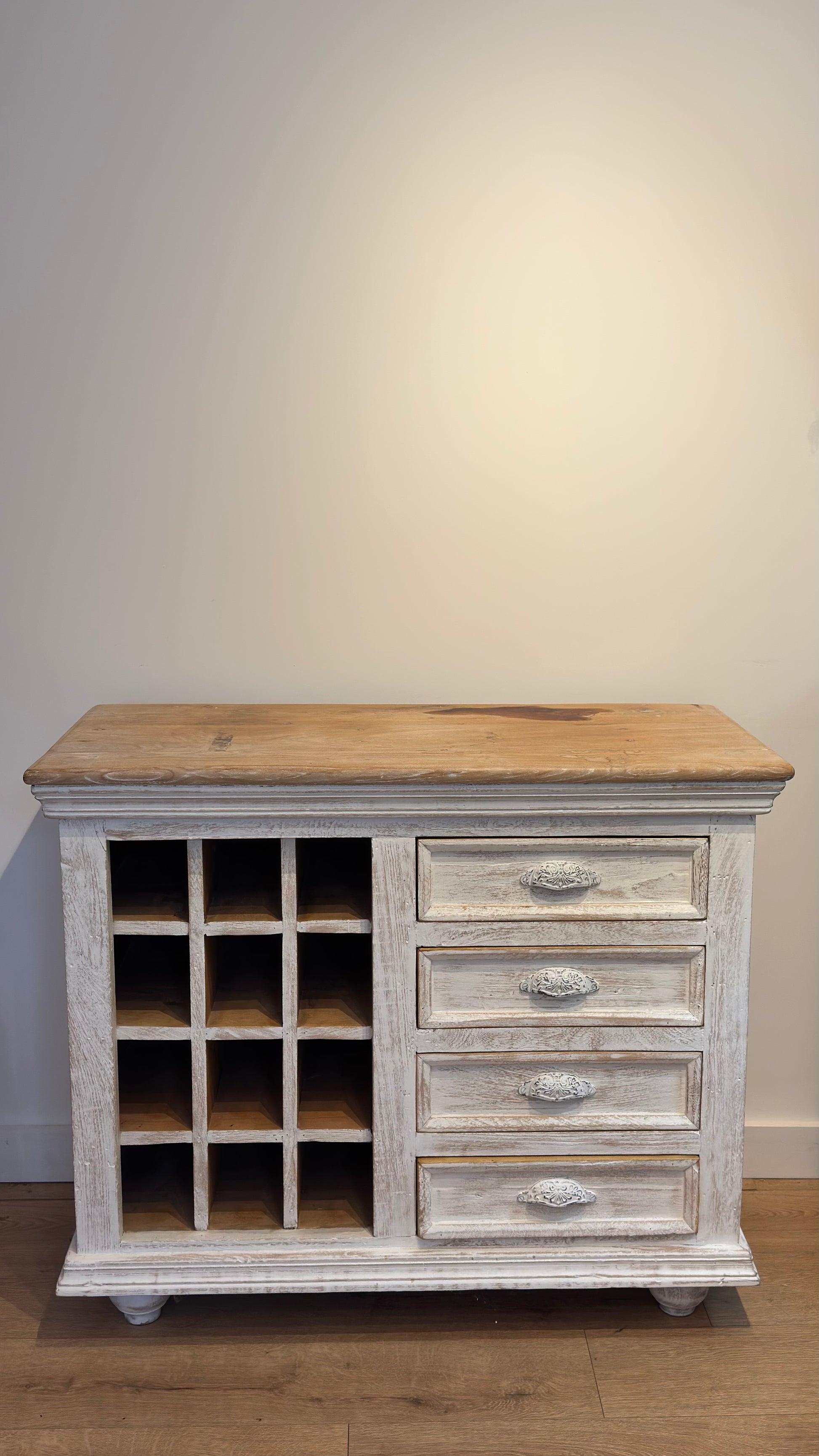 This elegant piece offers four spacious drawers with ornate handles and a 12-bottle wine rack — perfect for both storage and display.