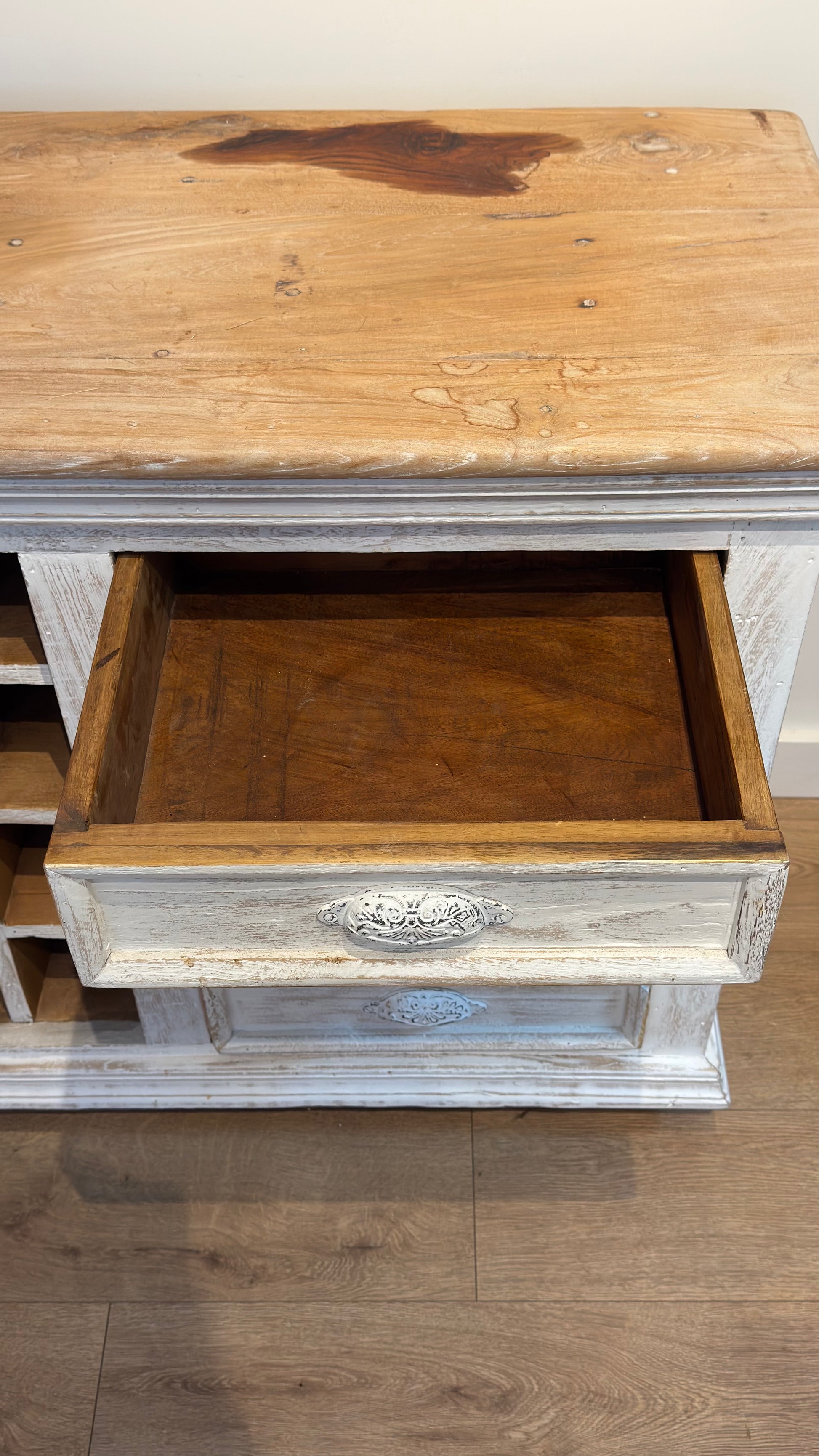 A beautiful solid wood sideboard featuring a natural oak top and a hand-painted distressed white body.