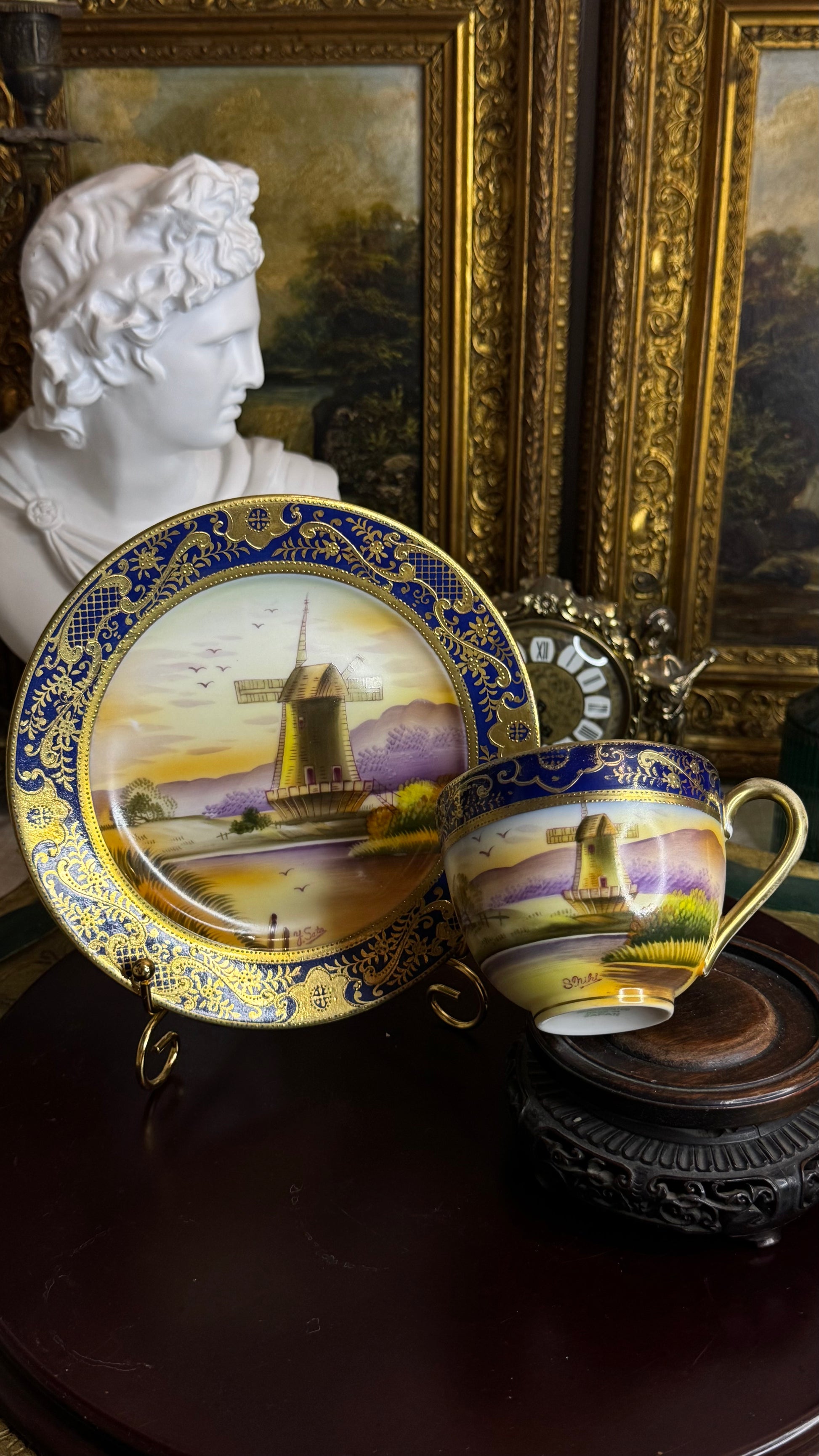An exquisite hand-painted Japanese porcelain cup & saucer decorated with a serene windmill landscape at sunset. The scenes sit beneath a deep cobalt blue border enriched with heavy raised gilt scrollwork.