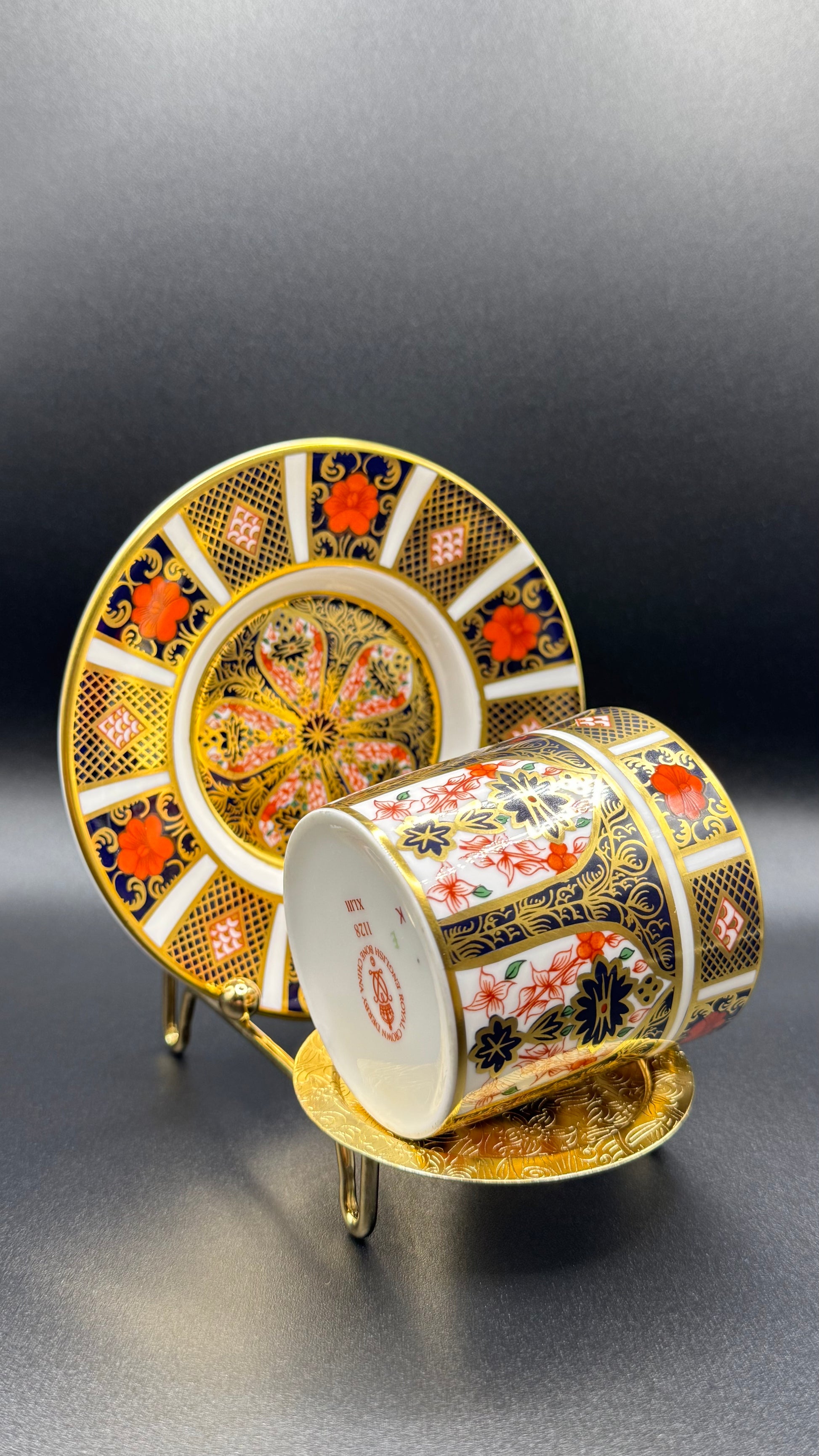 An elegant Royal Crown Derby porcelain cup and saucer in the iconic Old Imari pattern. Featuring the bold cobalt blue, iron red, and lavish 22ct gold gilding that defines this timeless design, this set showcases the craftsmanship and prestige of one of England’s most celebrated porcelain makers.